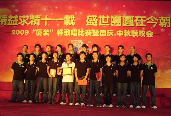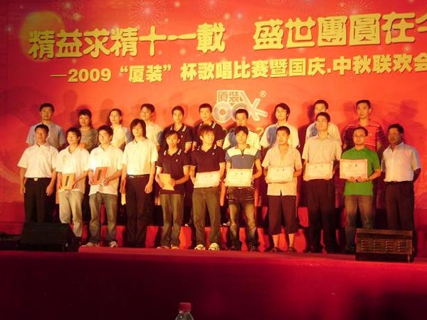 為喜迎“國慶·中秋”雙節(jié)的到來,慶祝廈裝公司成立11周年,廈裝公司于2009年9月29日舉行了規(guī)模盛大的“國慶·中秋”大聯(lián)歡活動。此次活動包括“歌唱祖國”歌唱比賽、頒獎儀式、文藝表演、中秋晚宴、中秋博餅等幾個環(huán)節(jié)。